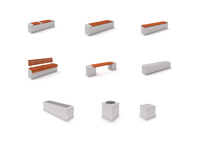 Ławki mogą być wykończone betonem Deco albo drewnianym blatem. Beton Deco jest dostępny w kolorze białym lub szarym, drewniane panele wykonane są ze świerka lub sapelli -  dostępnej w różnych kolorach.